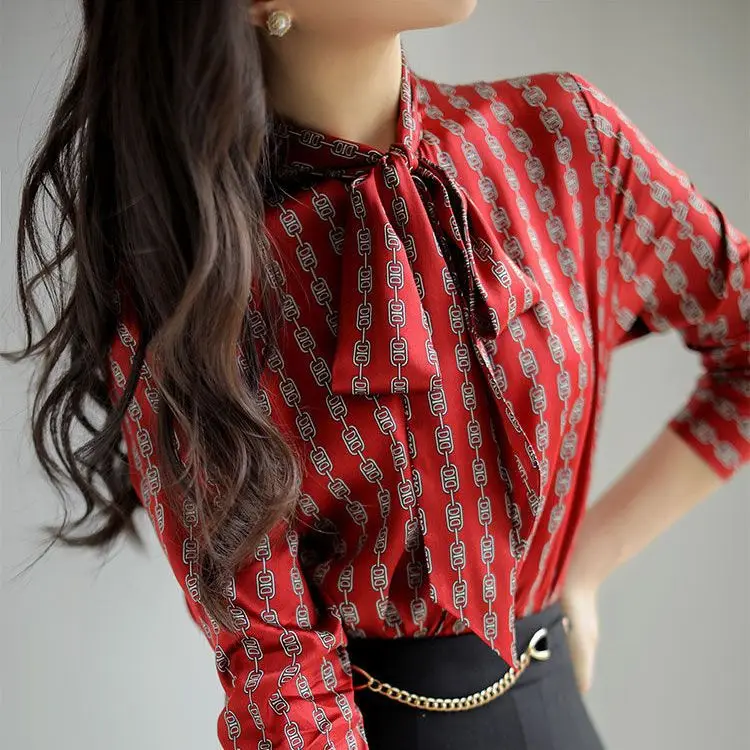بلوزة نسائية بأكمام طويلة ووشاح عتيق ، قميص مطبوع ، توبات شبابية فضفاضة غير رسمية ، ملابس نسائية أنيقة ، موضة جديدة